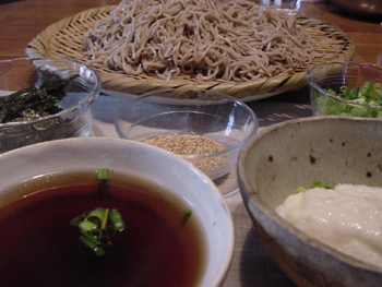 生蕎麦茹でて、出汁は、昆布と鰹節でとりました。 山芋、青ネギ、ゴマ、海苔などといただきます。 さっぱりと美味しかったです。